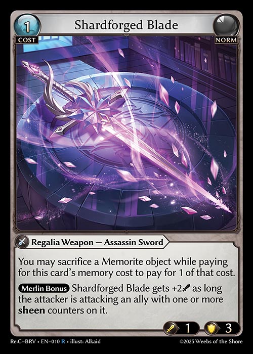 Sheen 8+ On Enter:素材デッキから Regalia を1枚 Banish してよい。そうしたらカードを1枚引き、Champion に preparation counter を置く。